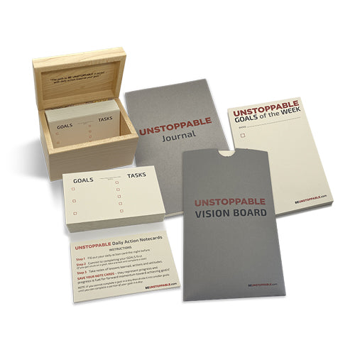Includes the UNSTOPPABLE Vision Board, UNSTOPPABLE Journal, UNSTOPPABLE Goals of the Week, UNSTOPPABLE Daily Action Cards and the UNSTOPPABLE Action Card Box.